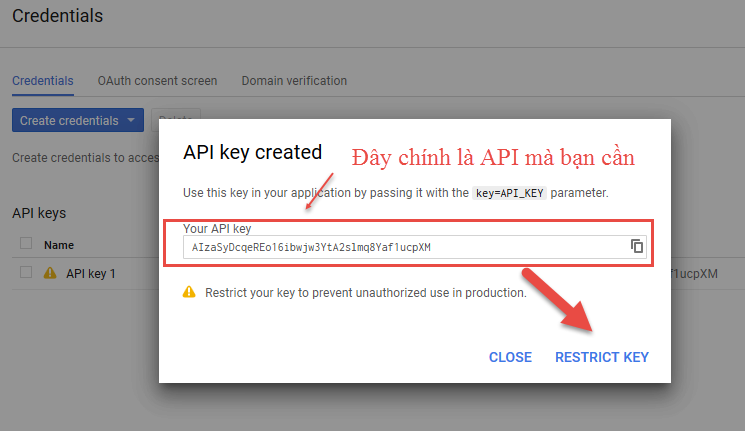 Bước 5: Tại đây → CREATE CREDENTITALS → bạn sao chép lại Your API Key để sử dụng → Restrict Key để tiếp tục cài đặt.