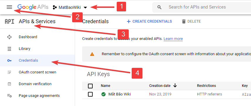 Bước 4: Sau khi Create xong → Project bạn vừa tạo → APIs & Servives → Credentials